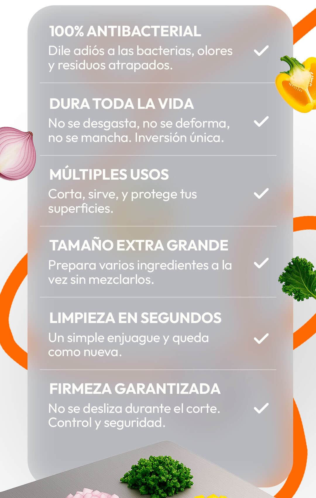 Desde carnes y pescados (donde su superficie antibacterial brilla) hasta frutas, verduras y hierbas.